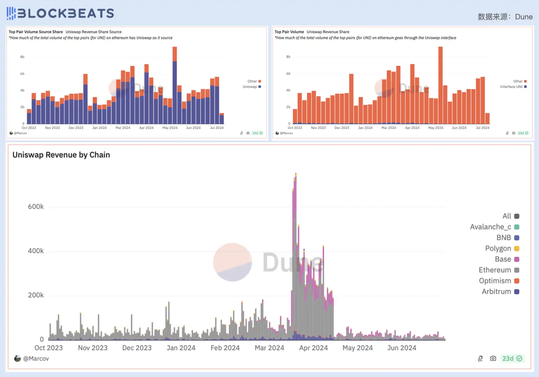 从费用收入的来源看,尽管 Uniswap 团队和社区在过去半年努力推进协议的多链发展,但以太坊主网仍然是协议目前**的费用来源,交易量仅 8 月 15 日一天就达 11.6 亿美元,其次是 Arbitrum 与 Base,二者交易量总和大致与主网相同。据 CoinGecko **报告显示,今年上半年,Uniswap 仍然是 ETH 消耗量**的应用协议,共计销毁约 71,915 枚 ETH。