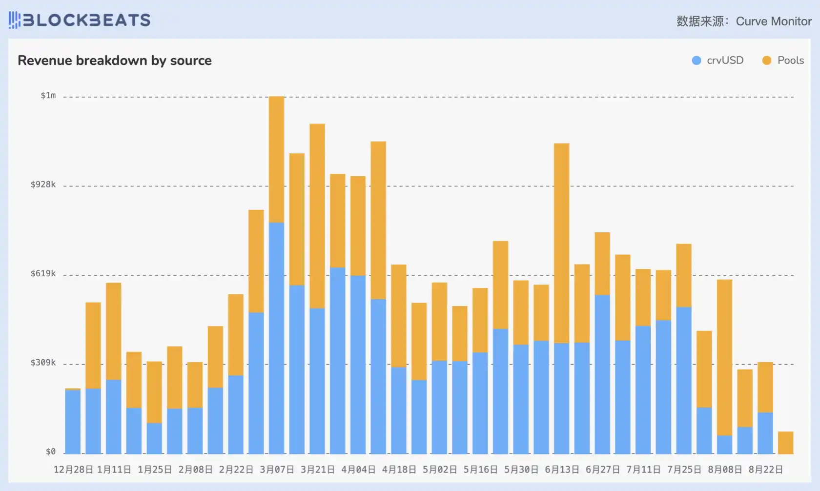 今年 6 月,Curve 改变其费用分配激励机制,从 3CRV **过渡到其原生稳定币 crvUSD,以提高 crvUSD 的实用性,增强 Curve 的稳定性和流动性,crvUSD 之于 Curve 的救赎作用曾一度**明显。从收入渠道看,crvUSD 推出以来一段时间内曾超过 Pool 的收入。但 8 月 5 日,加密行业发生大规模链上清算,致使 Curve 下调 crvUSD 的借贷利率,ETH、WBTC 等池子的利率低至零点几,资金出逃明显。