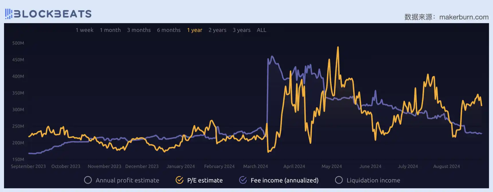 MakerDAO 官方公布 P/E 及协议年化盈利相关性