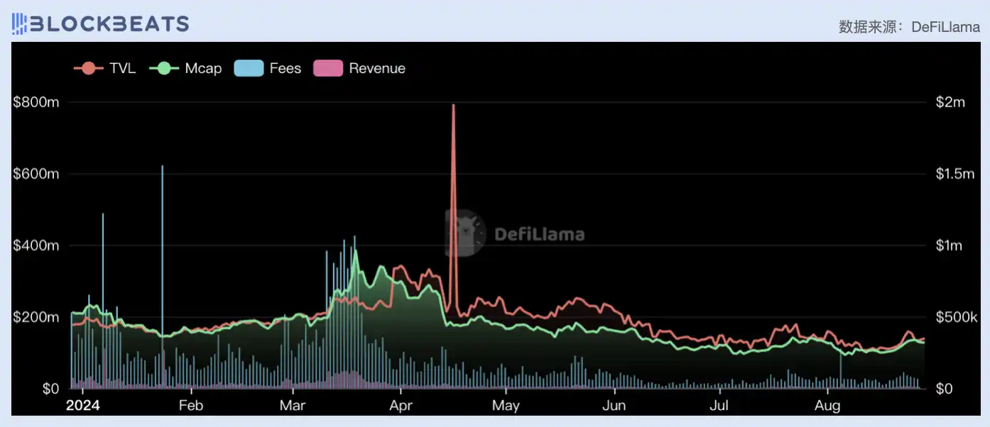 稳定币之外,Frax Finace 在现货交易和流动性质押市场的表现也不如以往。Fraxswap 对每笔交易收取 0.3% 的手续费,自从 TVL 跌至 6000 万美元以下后,这部分费用维持在 1000-5000 美元之间,DefiLlama 数据显示预估年化费用为 180 万美元。Frax Ether 日收入在今年也呈下降趋势,年化收入为 143 万美元。