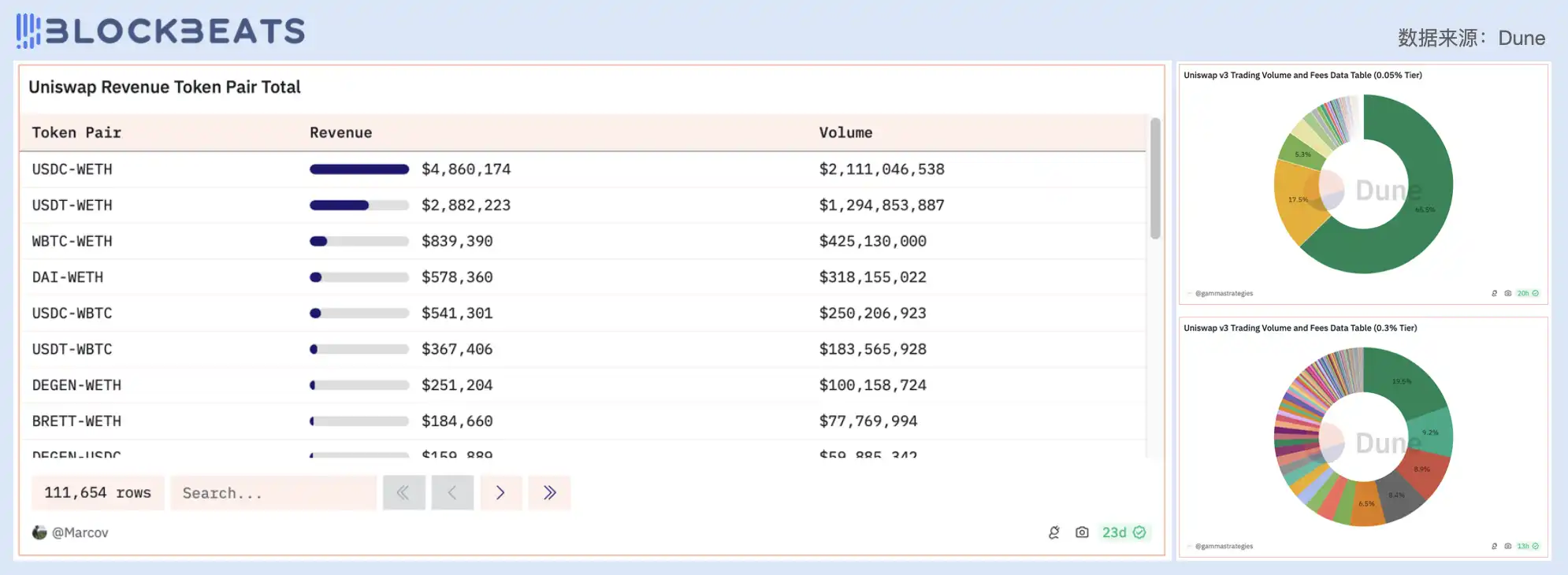 左上:Uniswap 头部交易对流动性来源占比;右上:Uniswap 头部交易对交易量(流量)来源占比;下:Uniswap Labs 盈利来源细分