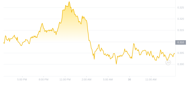 截至 2024 年 8 月 30 日 14:00,Sei (SEI) 的现价为 0.3046 美元。过去 24 小时内,交易量为 10,829 万美元,价格下跌了 0.75%。