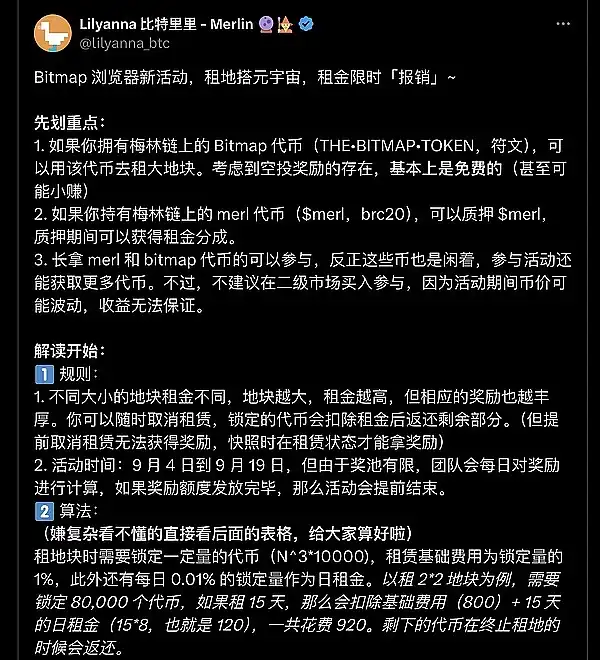 ● Bitmap Game @MerlinLayer2 @BitmapTech 租赁奖励活动,帮用户支付租用 bitmap 的费用,同时还有总量 420 万 bitmap token 奖励,质押 $MERL 可获得租金分成,持续时间 9/4 号到 9 月 19 号。