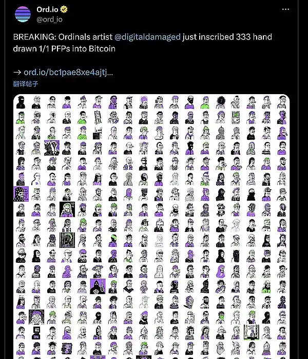 ● Ordinala 艺术家 @digitaldamaged 刚刚将 333 个手绘 1/1 PFP 刻入比特币网络。