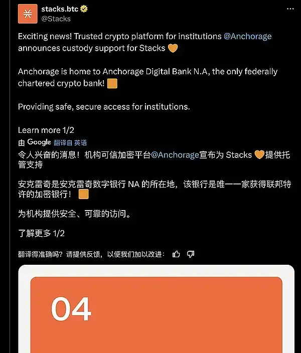 ● 机构可信加密平台 @Anchorage 宣布为 Stacks @Stacks 提供托管支持,Anchorage 是 Anchorage 数字银行 NA 的所在地,该银行是**一家获得联邦特许的加密银行。