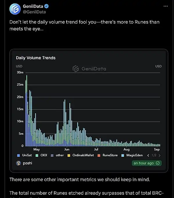 ● 在短短 5 个月内,符文已经产生了超过 2,200 BTC 的费用,按 58,000 美元的 $BTC 价格计算,相当于超过 1.27 亿美元。@GeniiData