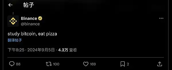 ● 币安 @binance 发推:study bitcoin, eat pizza