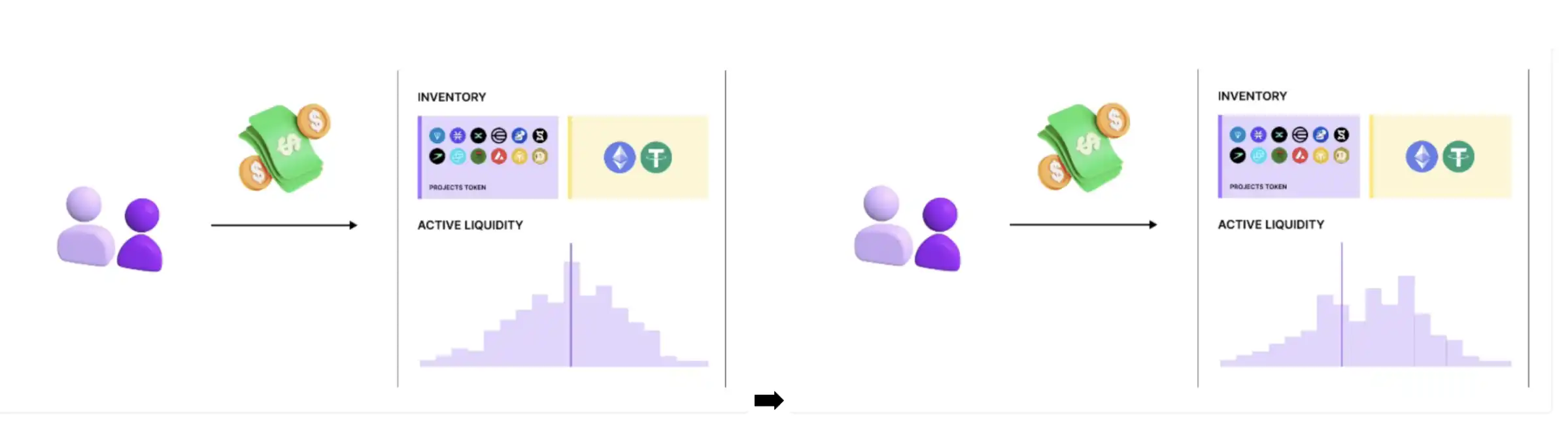 MaaS 将负责根据协议所有者的偏好在市场上动态维持**水平的流动性。主动流动性逐渐再平衡,以 50-50(以太币/稳定币 - 项目**)的比率在当前池价格附近实现深度流动性。