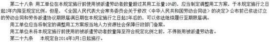 此外,**人社部官网显示,《劳务派遣暂行规定》自2014年3月1日起施行。该规定要求,用工单位在规定施行前使用被派遣劳动者数量超过其用工总量10%的,应当制定调整用工方案,于2016年3月1日前降至规定比例。