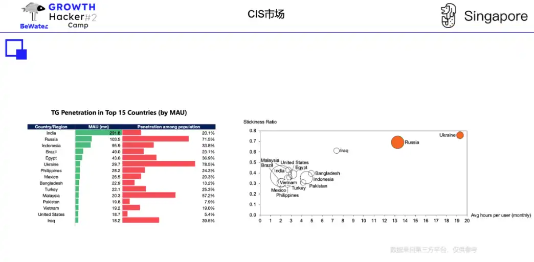 整个 ** 生态立的市场高地在 CIS 地区,俄语区的市场「高地」不光体现在用户数量,更是用户质量、用户使用时长、用户 commitment,这块市场是最值得做的。Notcoin、Dogs、Hamster 等明星 ** 项目来自俄语区,而 Catizen 已经做了很好的俄语市场融入。其他地区如印度虽然人数 MAU **,但是用户价值与渗透率均不高,另外,还有些市场比如伊朗反倒是值得关注。
