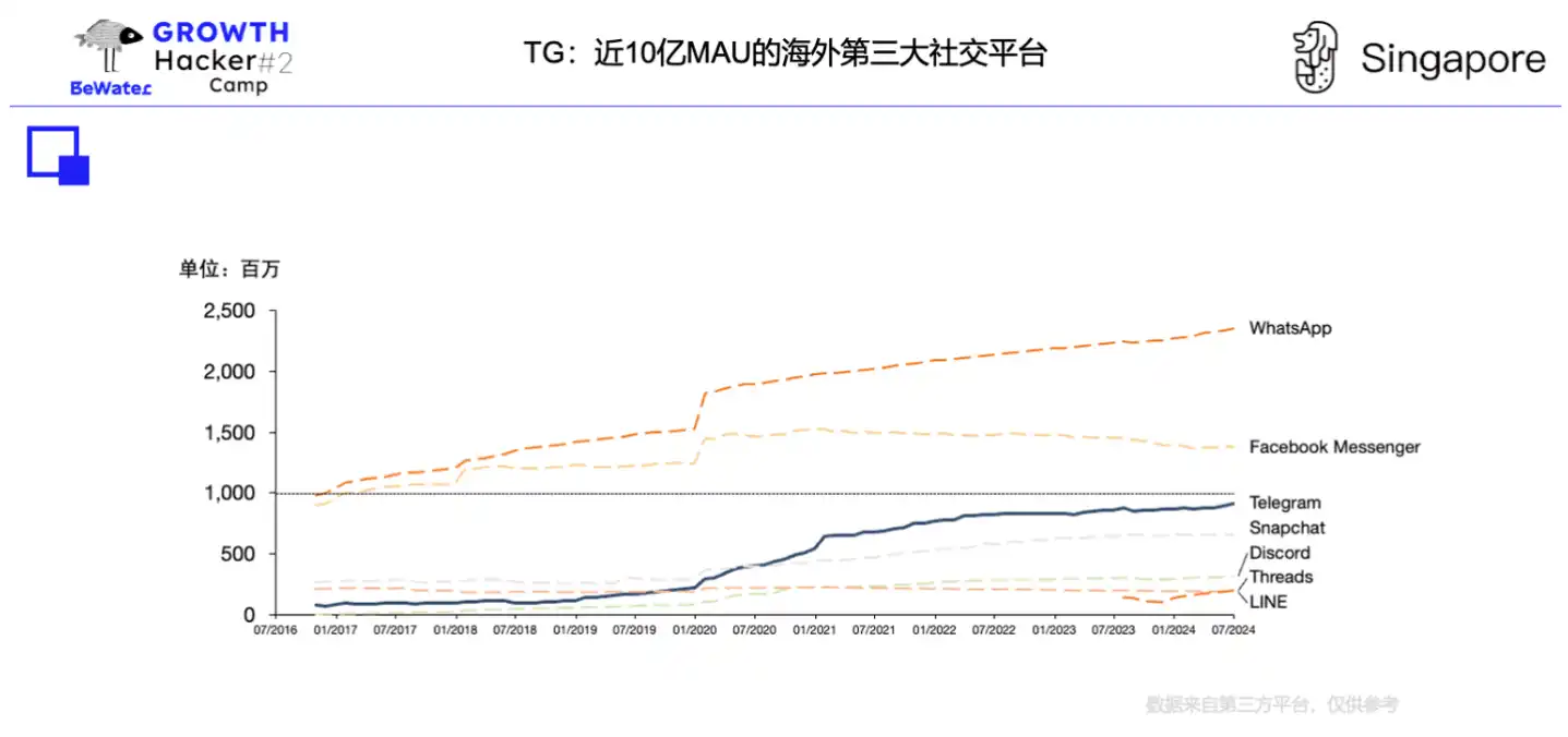 除发达**之外,** 是 2.4 亿人口的 CIS 地区的「微信」,另外**市场包括印度、印尼、尼日利亚和伊朗等第三世界新兴市场的人口大国,Telegram 接近 10 亿的用户,其实 Crypto 用户比例还并不是那么高,在很多**就是一个国民 IM 软件使用,而不是擦边、地下通讯软件。