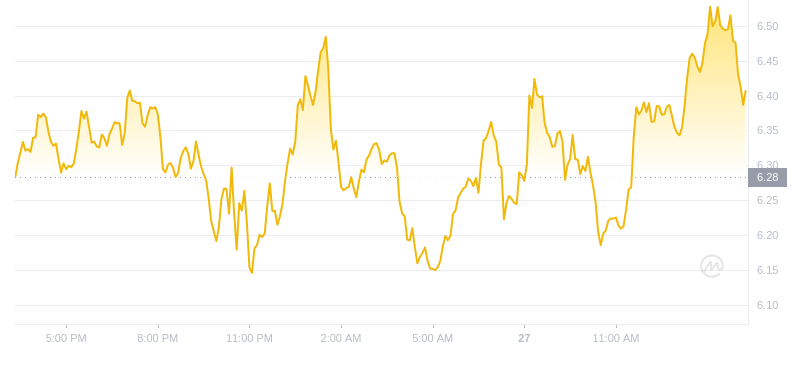 截至 2024 年 9 月 27 日 15 时,Celestia (TIA) 报 6.38 美元,涨幅 1.71%。过去 24 小时的交易量为 1.77 亿美元,流通市值为 13.65 亿美元。