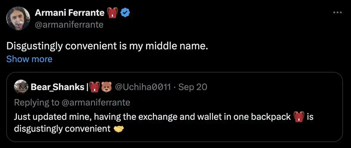 Ruby:Backpack 是从 web3 钱包开始,现在增加了交易所的体验到钱包里。而多数**化交易所如 Binance、OKX、Bybit 等也都在 CEX App 里增加 web3 钱包,**大家都想打造 Super App,你们如何提供独特的服务和产品体验?怎么看待这种比较?