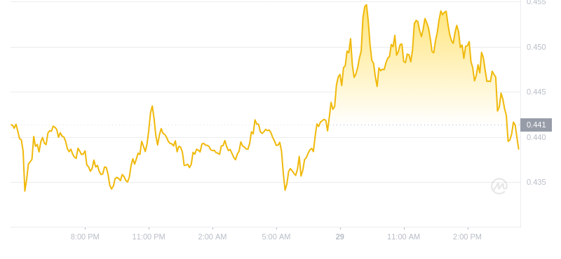 截至 2024 年 9 月 29 日 16:00,Sei (SEI) 的价格为 0.4398 美元,24 小时交易量为 1.66 亿美元。
