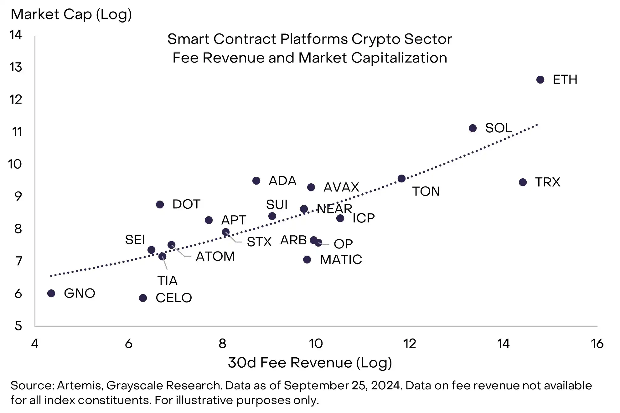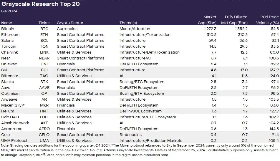 · Grayscale Research 汇总的前 20 名**已经更新。前 20 名代表了加密行业的多元化资产组合。这些资产在未来一个季度具有很高的潜力。本季度新增资产为 SUI、TAO、OP、HNT、CELO 和 UMA。