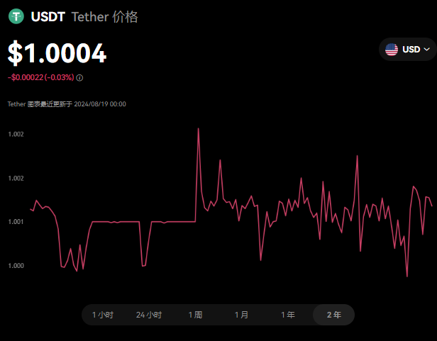 USDT(Tether)是一种与美元挂钩的稳定币,由Tether公司发行。这意味着USDT的价值旨在始终与美元保持1:1的比例。USDT是目前加密货币市场上最受欢迎的稳定币之一,主要用于加密货币交易所之间的转账和避险。
