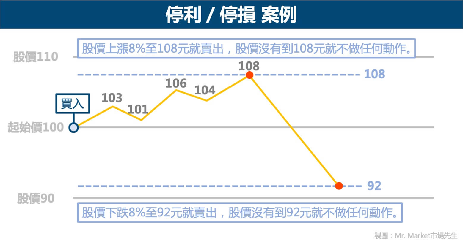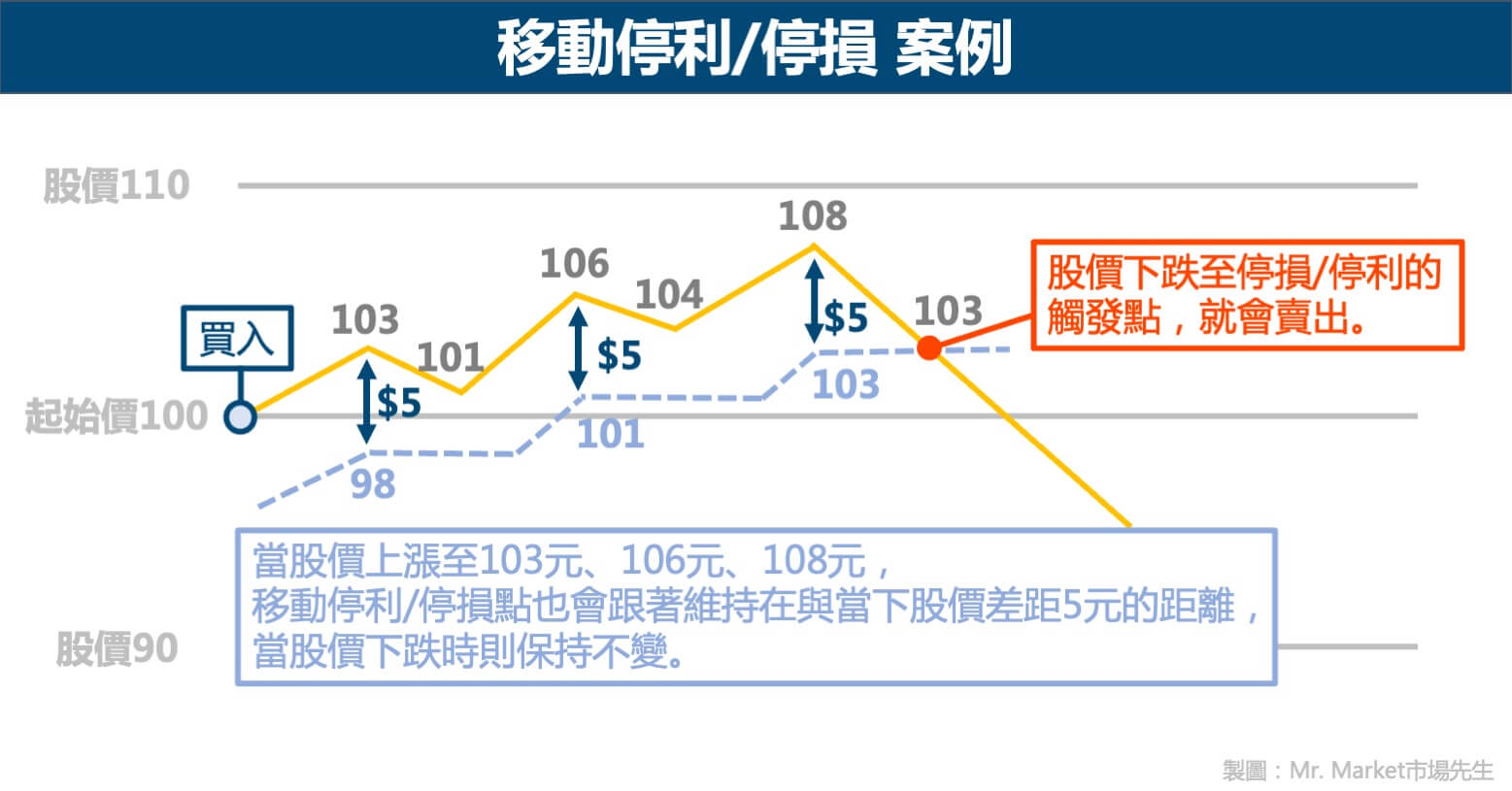 以这个案例来说,如果是只有设定止损及止盈点,一股有可能赚8元或赔8元,但如果是移动止盈/止损点,就会在股价下跌时就能即时出场,卖在103元,也还是赚了3元。(先不假设手续费等交易费用)