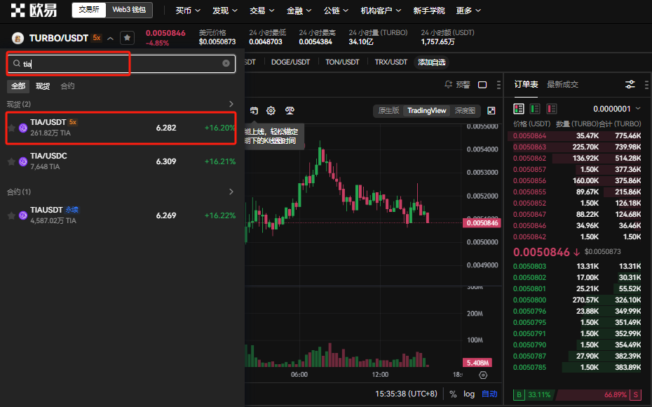 9、在搜索框输入TIA,选择TIA/USDT交易对,可以看到TIA实时行情