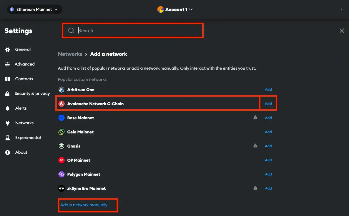 步骤 3. 搜索并选择 Avalanche 网络 C 链或手动添加网络