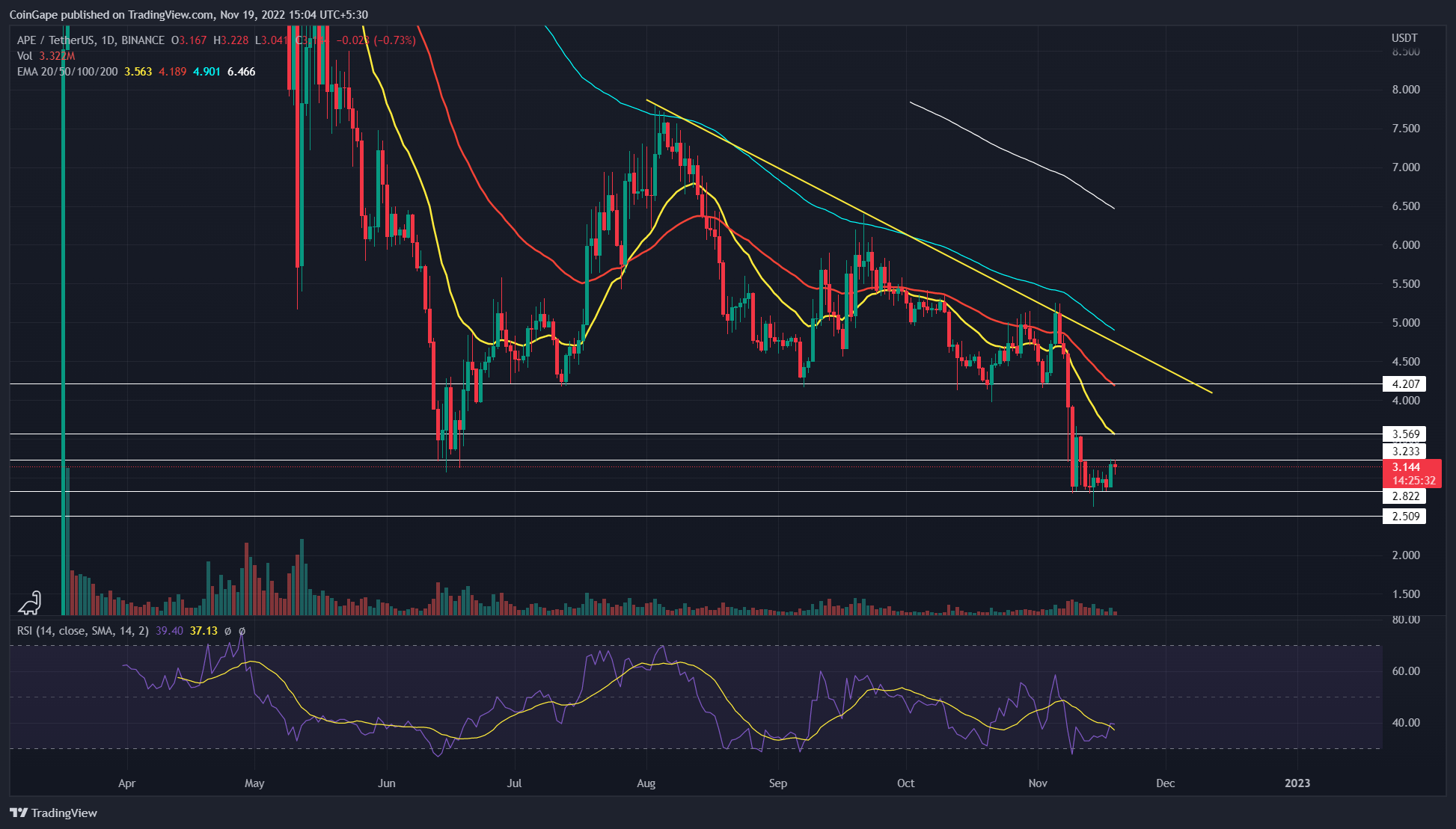 在最近由FTX 加密货币交易所崩溃引发的大屠杀中,Apecoin 价格突破了 4.2 美元的颈线支撑。崩盘后的下跌使市值暴跌 29%,跌至 2.7 美元的低点