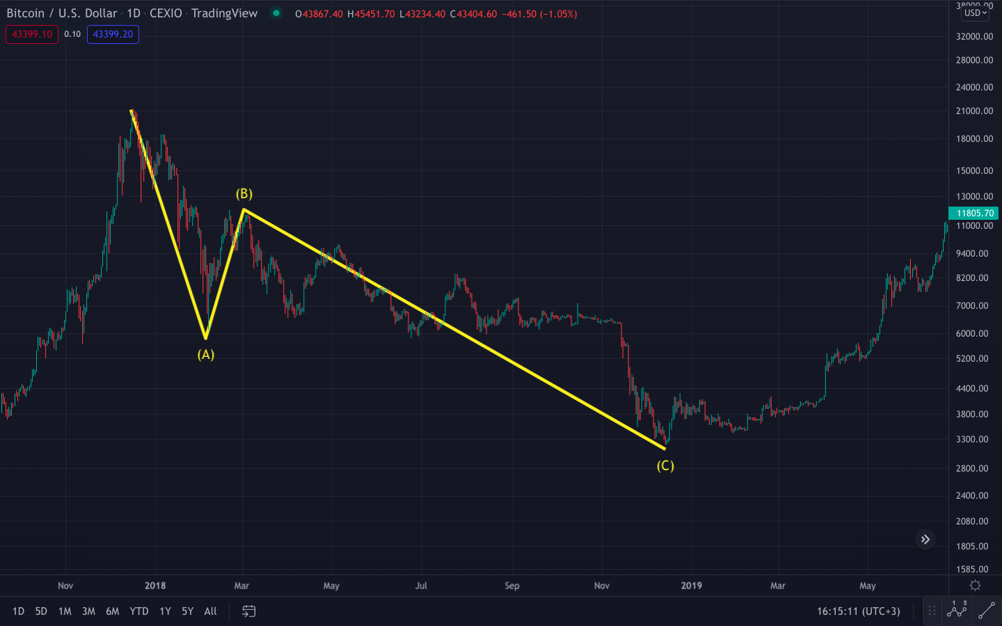 比特币在其 2018-19 熊市期间遵循**的 ABC 修正序列,您可以在下图中观察到。