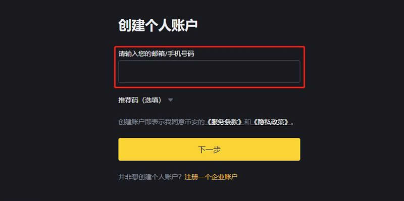 2、币安已**开放大陆用户进行手机号注册,输入邮箱/手机号、点击下一步即可