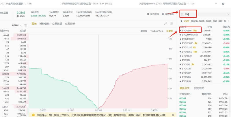 7、搜索币种简称【BTC】,选择【BTC/USDT】交易对