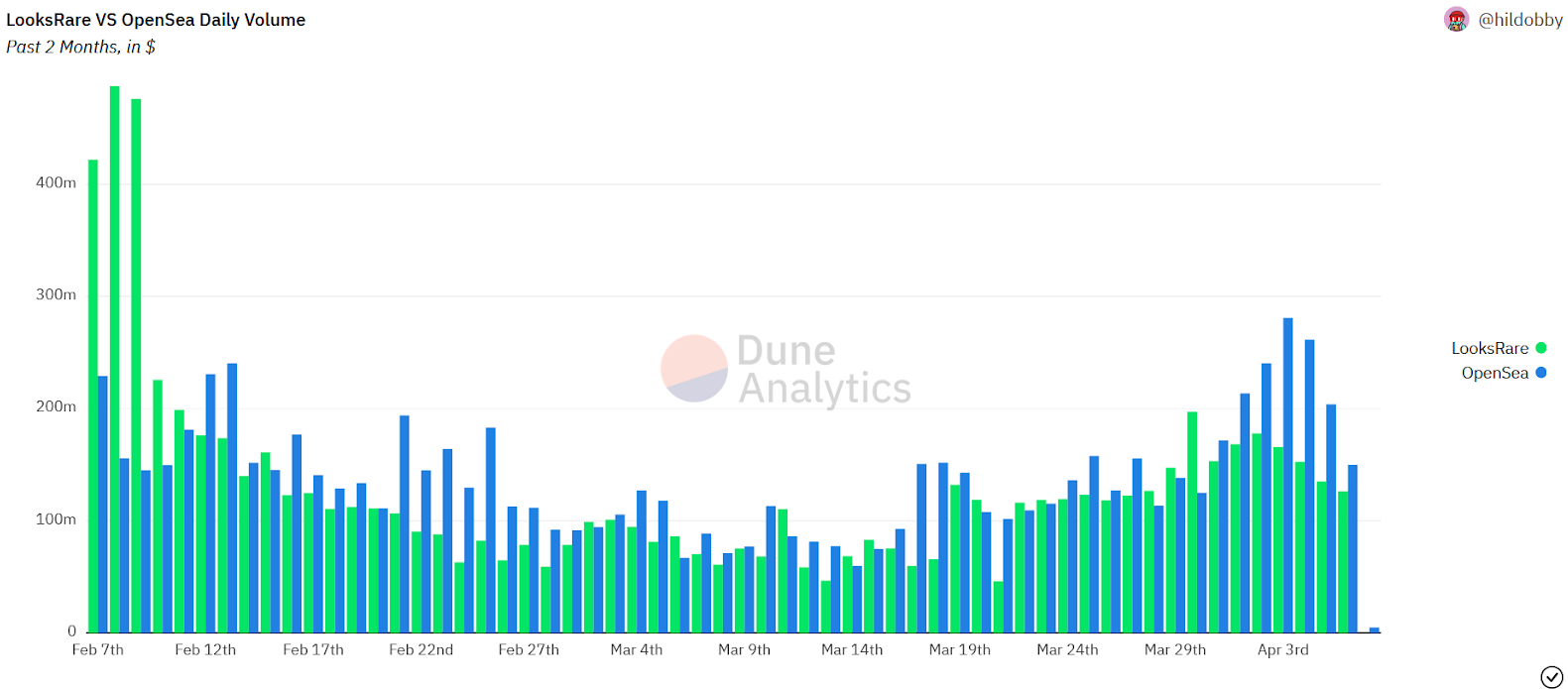 与现有的 OpenSea 相比,LooksRare 能够保持健康的数量。尽管从上图拍摄时起只有 4 个月大。应该注意的是,LooksRare 的部分体积可能是人为的,但上图试图删除该体积。即使 LooksRare 的体积实际上只有显示的一半,它仍然令人印象深刻。