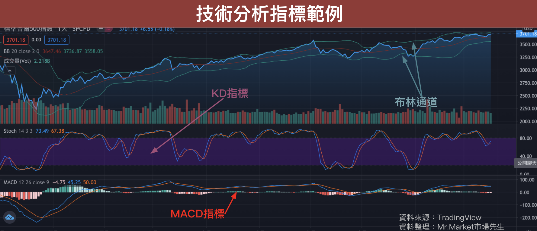 技术分析指标的两种呈现方式就会如下图,属于叠加指标的布林通道,就会直接叠加在标的的价格上(图为标普S&P 500);而像是KD指标或是MACD指标等属于震荡指标的,就会显是在图表的下方(或上方),而不与价格叠加。