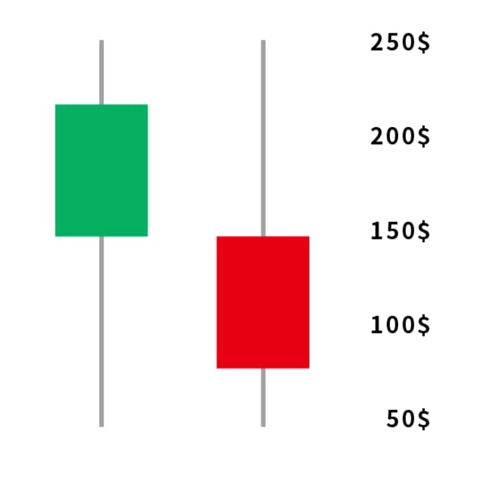 右边② 的图形是红K 线(又称红K 棒),表示收盘价「低于」开盘价。以上图为例,当日的开盘价为150 元,**曾涨至200 元(上影线),**曾跌至50 元(下影线),而**收盘价为100 元。