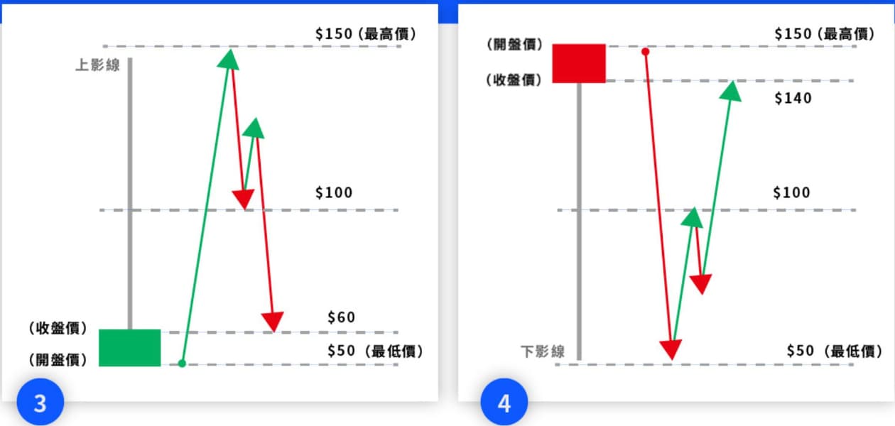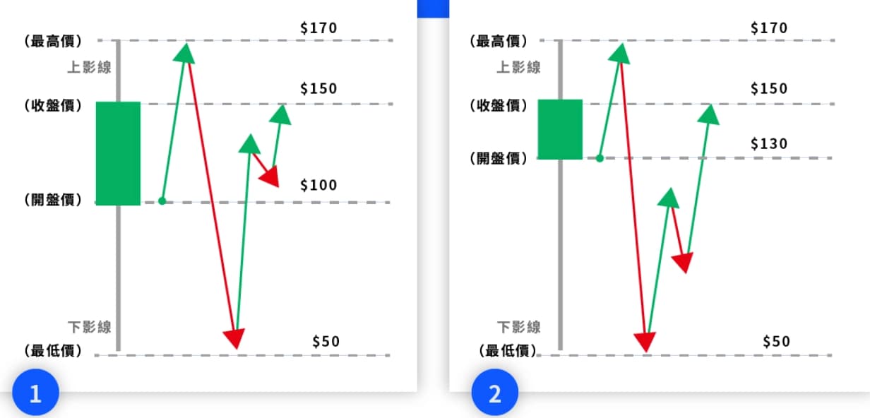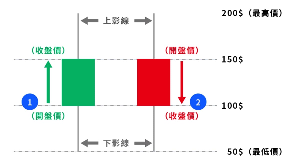 左边①的图形是绿K 线(又称绿K 棒),表示收盘价「高于」开盘价。以上图为例,当日的开盘价为100 元,**曾涨至200 元(上影线),**曾跌至50 元(下影线),而**收盘价为150 元。