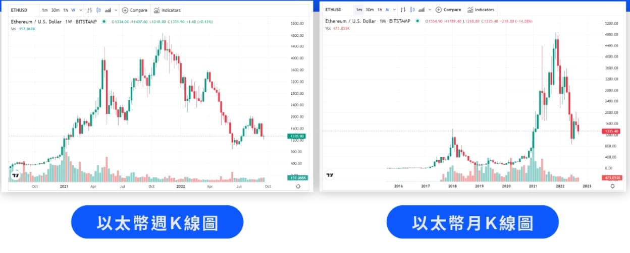 本篇文章都是以日K 图作为范例,日K 记录了24 小时内的价格波动,周K、月K 图只是记录时间长短不同。周K 则是将一周内的价格涨跌变化,都记录在一根周K 棒里;月K 将一个月内的价格涨跌变化,都记录在一根月K 棒内。