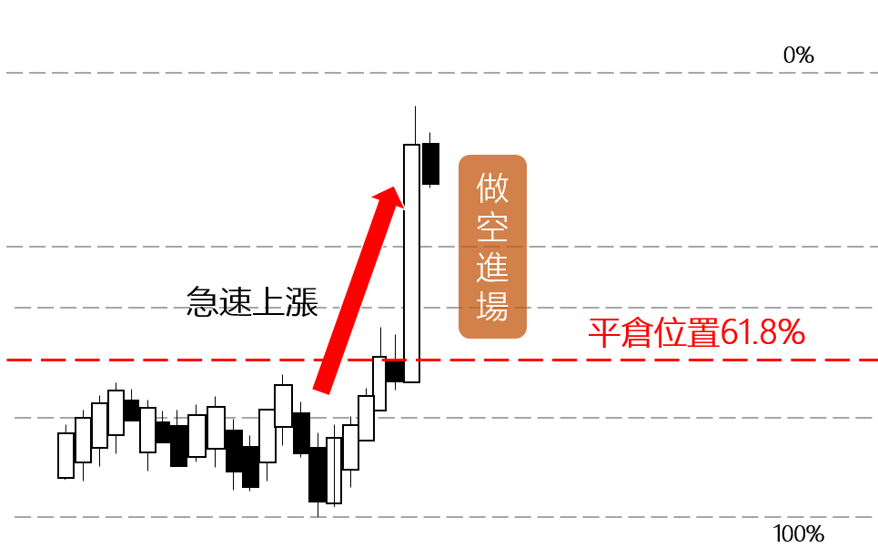 在这短时间内上升趋势突然出现价格下跌时,预测将在61.8%的线的位置反弹,在达到这条线之前设定空单,达到61.8%的位置时回补空单同时多头仓位进场的话,会有很高的交易优势。