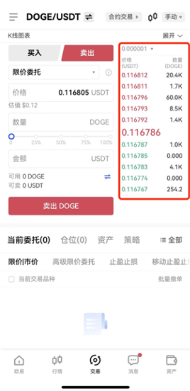 币对挂单信息查看:【买入/卖出】页面右边是交易深度页面,可以在页面中看到买入和卖出的挂单情况,上方红**域是卖盘,下方绿**域是买盘。