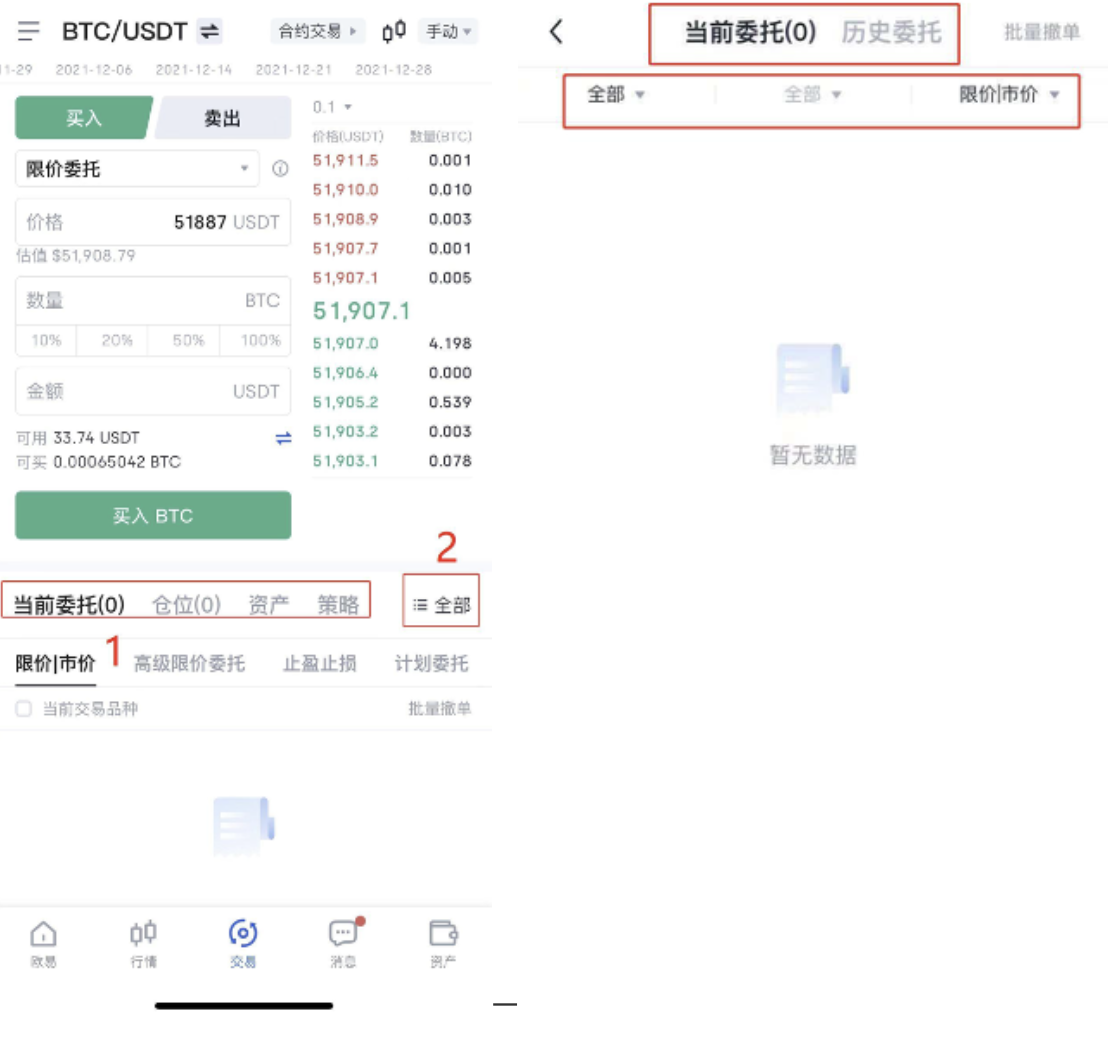 例如在【当前委托】页面点击【**】按钮,可以查看您的【当前委托】(即当前没有成交的挂单)、【历史委托】(即已经成交和已撤销没成交的委托单子),委托单里可以详细看到您的委托时间,币对和成交量等信息。
