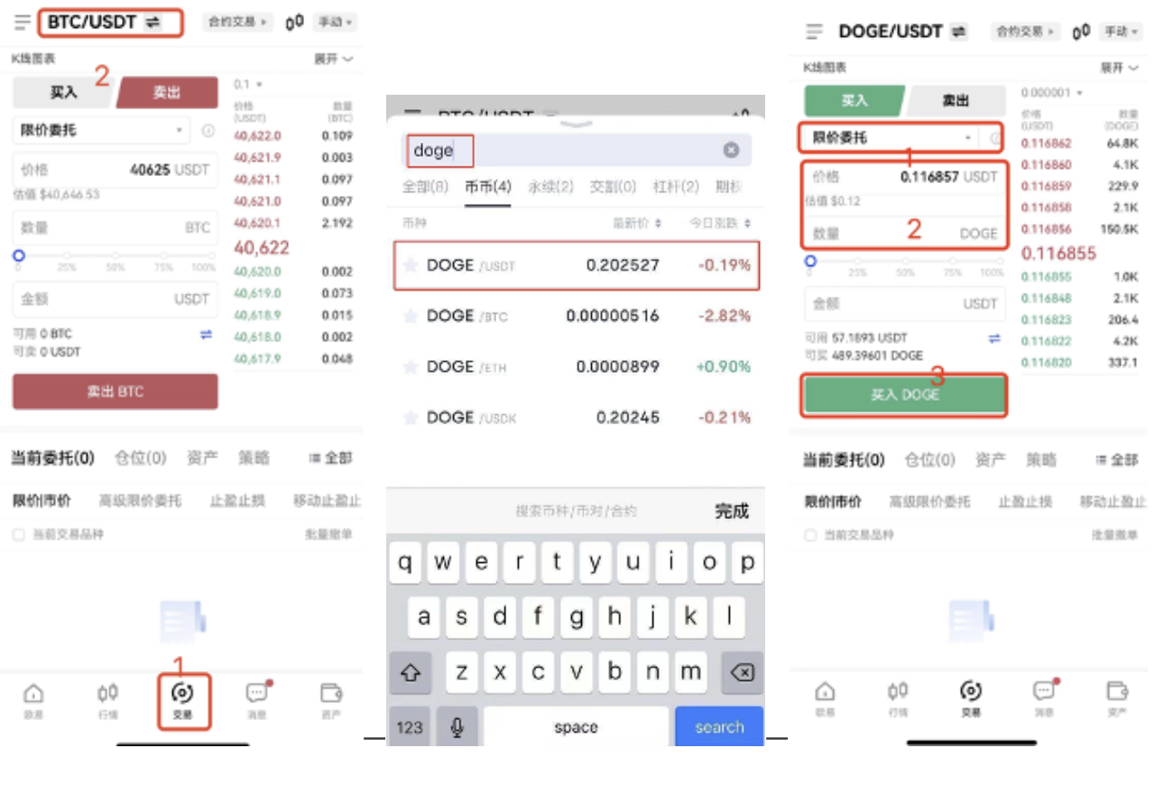 以狗狗币DOGE为例:进入【交易】页面 — 点击左上角币对框【BTC/USDT】。