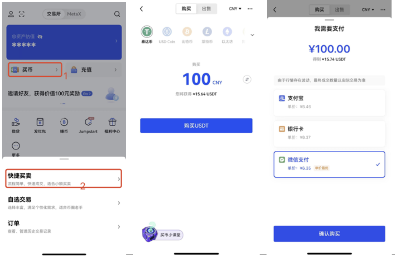 打开欧易 APP首页,点击【买币】—【快捷买卖】—【购买】—输入【购买金额】或者要买的【币种数量】—【购买USDT】—选择支付方式—【确认购买】。