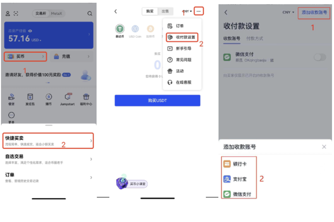 打开欧易 APP首页,点击【买币】—【快捷买卖】—右上角【更多】图标—【收付款设置】—【添加收款账号】,选择相应的银行卡/支付宝/微信支付进行设置即可。