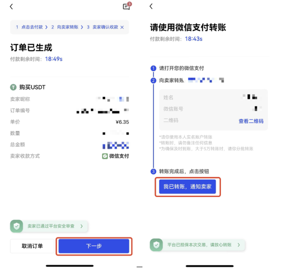 订单确认之后,点击【下一步】;及时打开手机银行APP/支付宝/微信,输入对方账户信息进行付款,完成之后,点击【我已转账,通知卖家】。对方核实款项后,您所购买的数字资产就会发放给您,可以在【资产】栏查看。