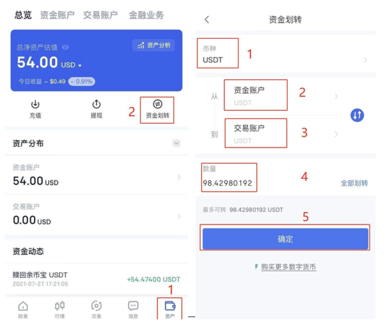 打开APP,【资产】—【资金划转】—选择币种,以【USDT】为例—【资金账户】—【交易账户】—输入划转【数量】—【确定】。