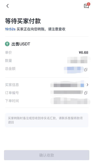 点击【确认出售】,等待买家付款,待确认收款点亮后即表示对方已付款,请及时查看钱款到账情况,请务必登录手机银行或网银查看到账情况,确认钱款到账后输入资金密码,然后尽快点击【确认收款】将数字资产发放给买家即可。