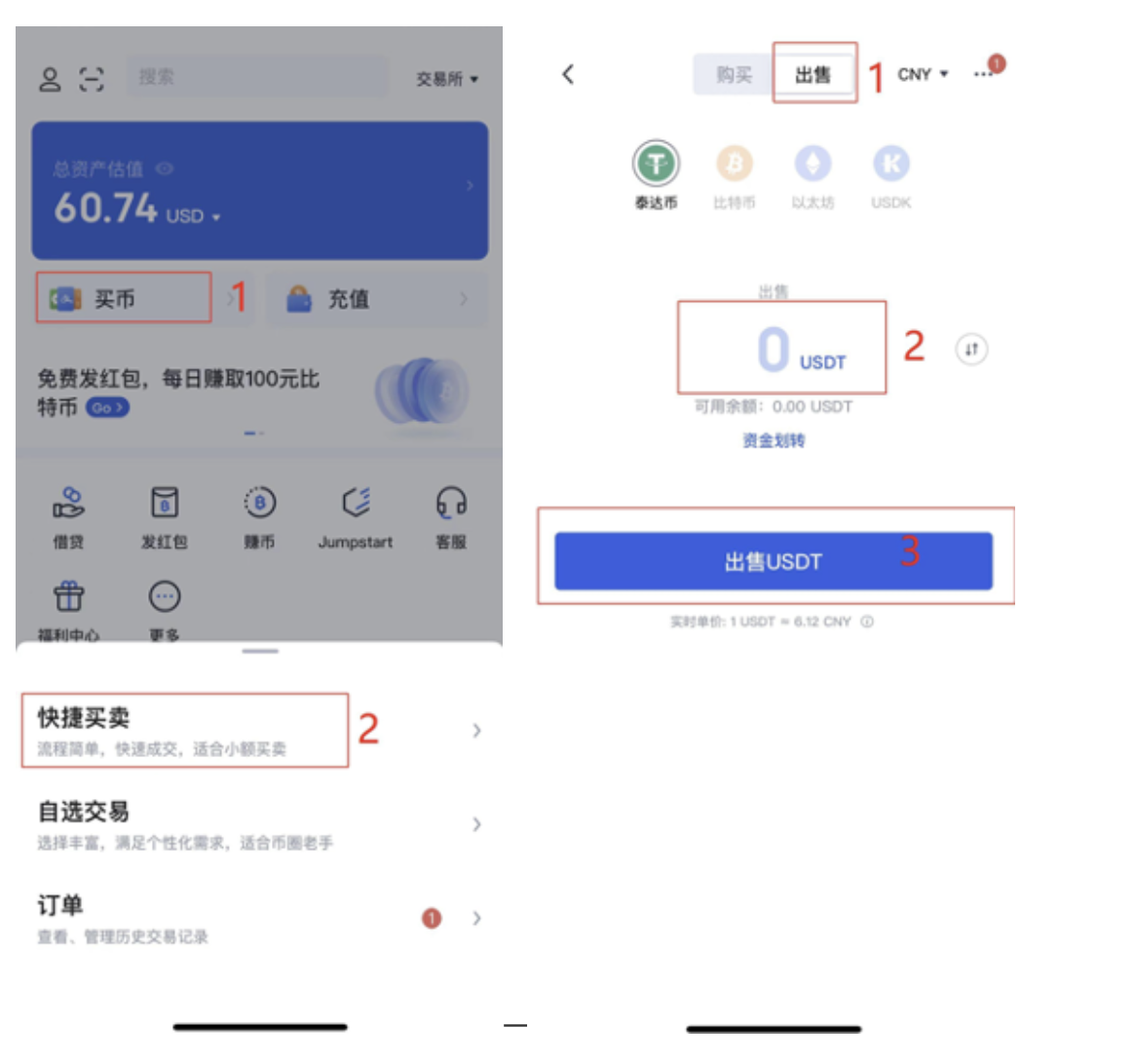 以USDT为例:打开欧易APP首页,点击【买币】—【快捷买卖】—【出售】—输入【卖出数量】—【出售USDT】。