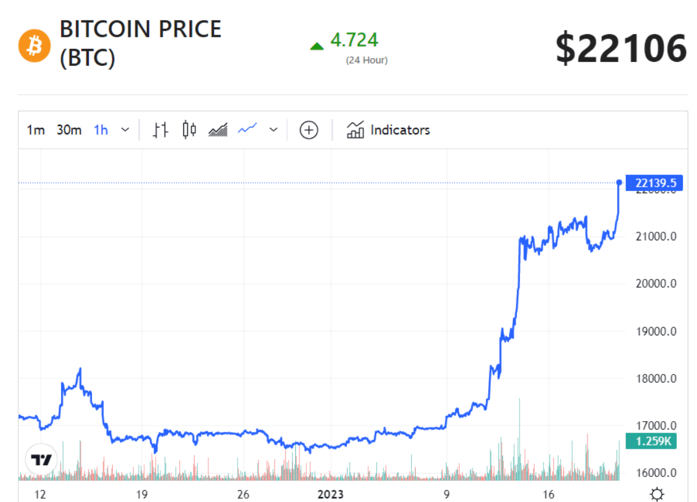 1 月 18 日,比特币(BTC)价格收复了之前因FTX疫情造成的所有损失,并在周五下午达到**点 22,216 美元。该资产升至超过 22,000 美元的水平导致市场参与者体验到更高水平的兴奋,即使像Genesis 这样的加密货币巨头申请破产程序也是如此。