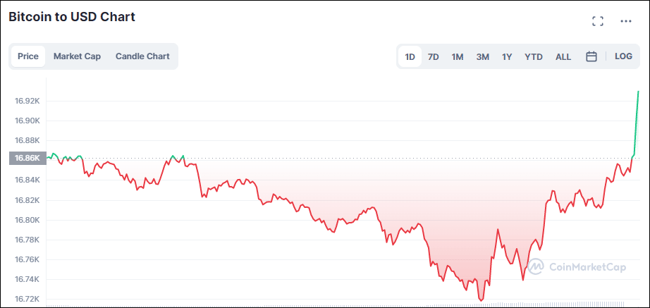 目前,比特币 (BTC) 的交易价格为 16,954 美元。根据加密货币市场追踪机构 CoinMarketCap的数据,这意味着当天上涨了 0.58%,而本周上涨了 2.5%