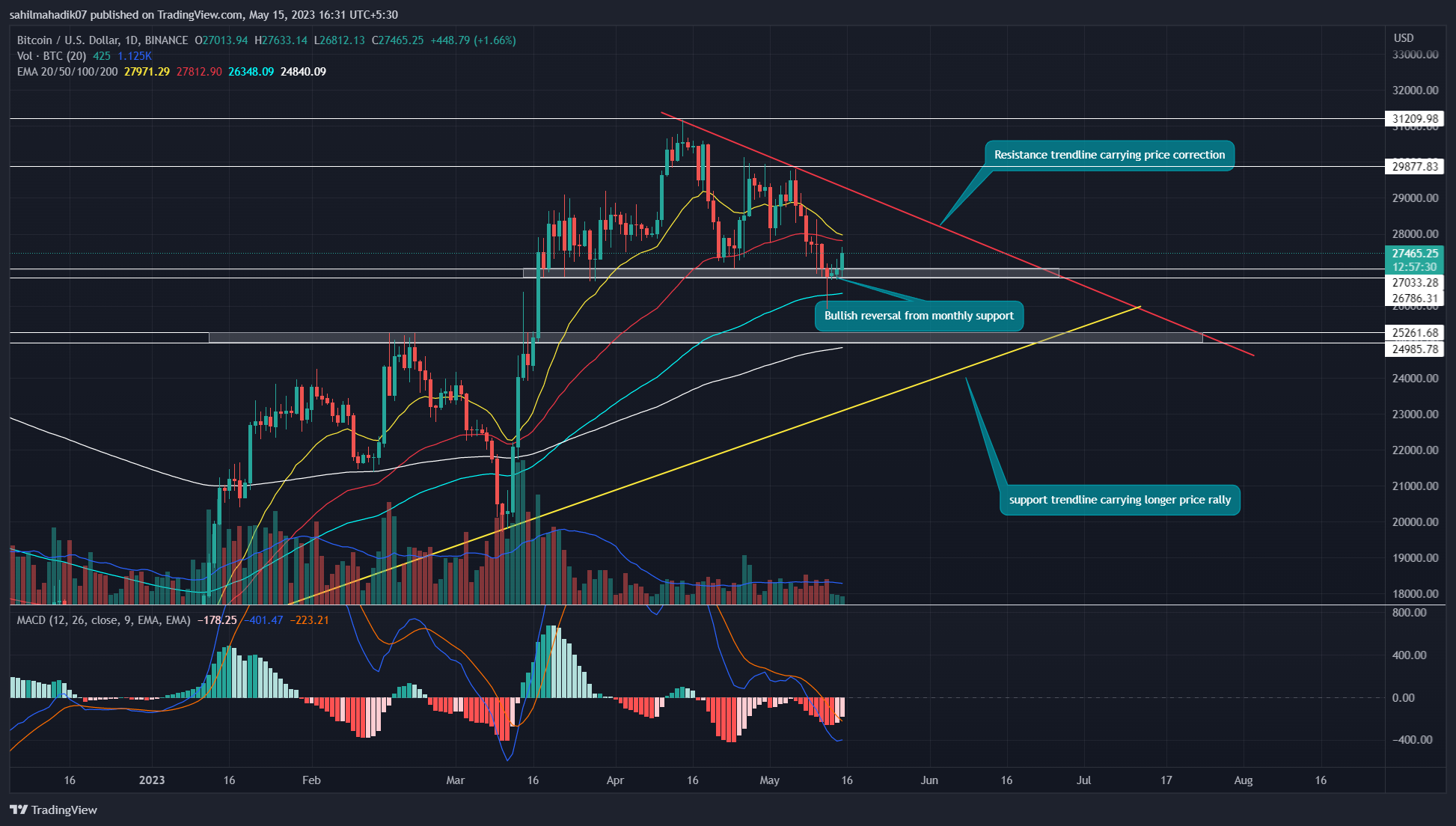 比特币btc今日**价格:5 月 12 日,比特币价格尝试从 27000-26786 美元的月度支撑位下破。然而,到当天结束时,日图收盘时回升至上述支撑位上方,表明买家继续捍卫该支撑位。结果,币价在最近三天上涨了 2.5%,达到了 27456 美元的当前价格。然而,这种逆转是否足以恢复 BTC 之前的复苏反弹?