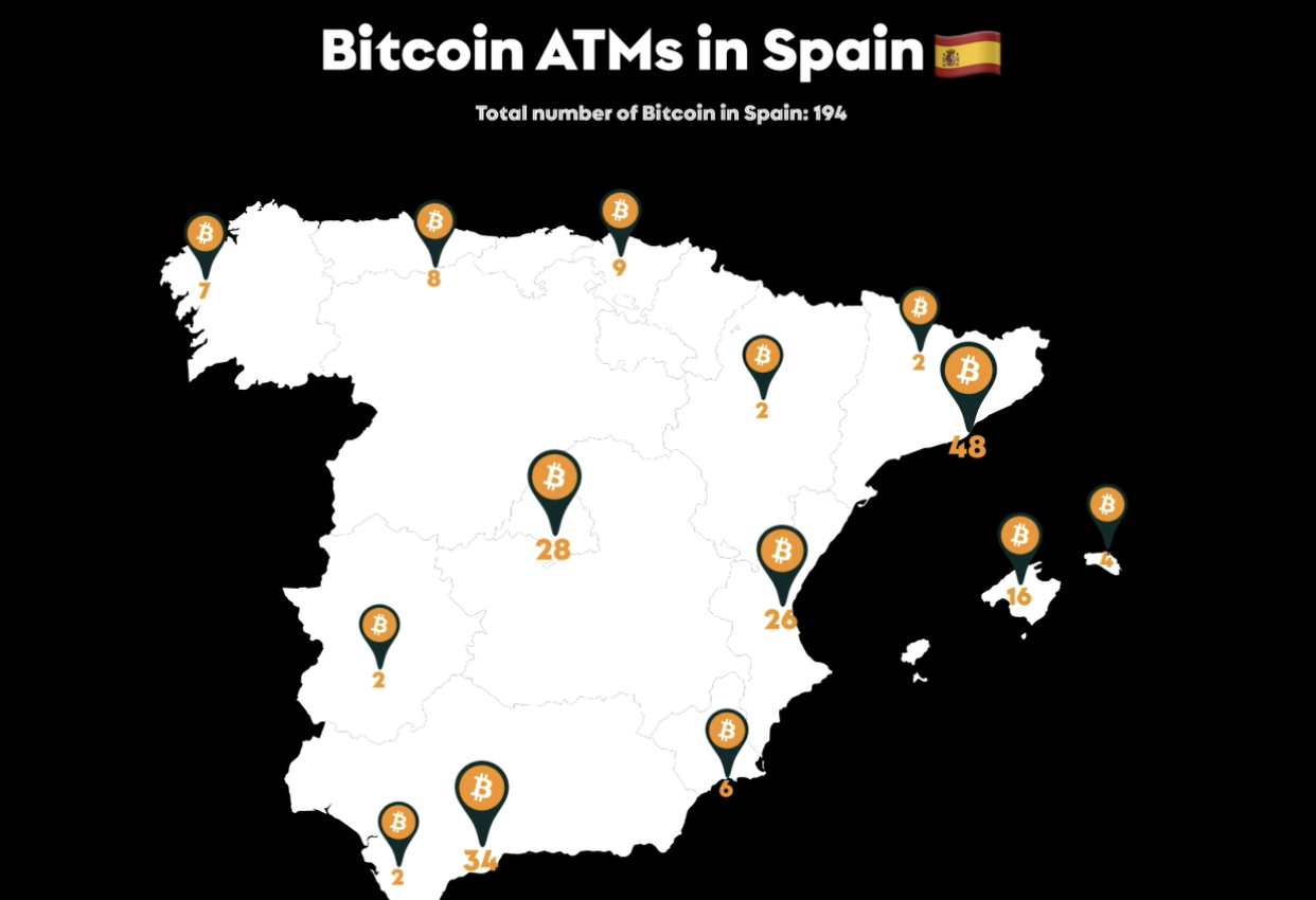根据 Coin ATM Radar,西班牙有 194 台比特币 ATM。这可能看起来并不多,但它使西班牙比许多其他欧洲**处于更好的位置。这些 ATM 中的大多数位于主要城市,例如巴塞罗那有 58 台 BTM,马德里有 41 台。比特币 ATM 高度集中的其他城市包括马拉加有 14 台,马略卡岛帕尔马也有 14 台。