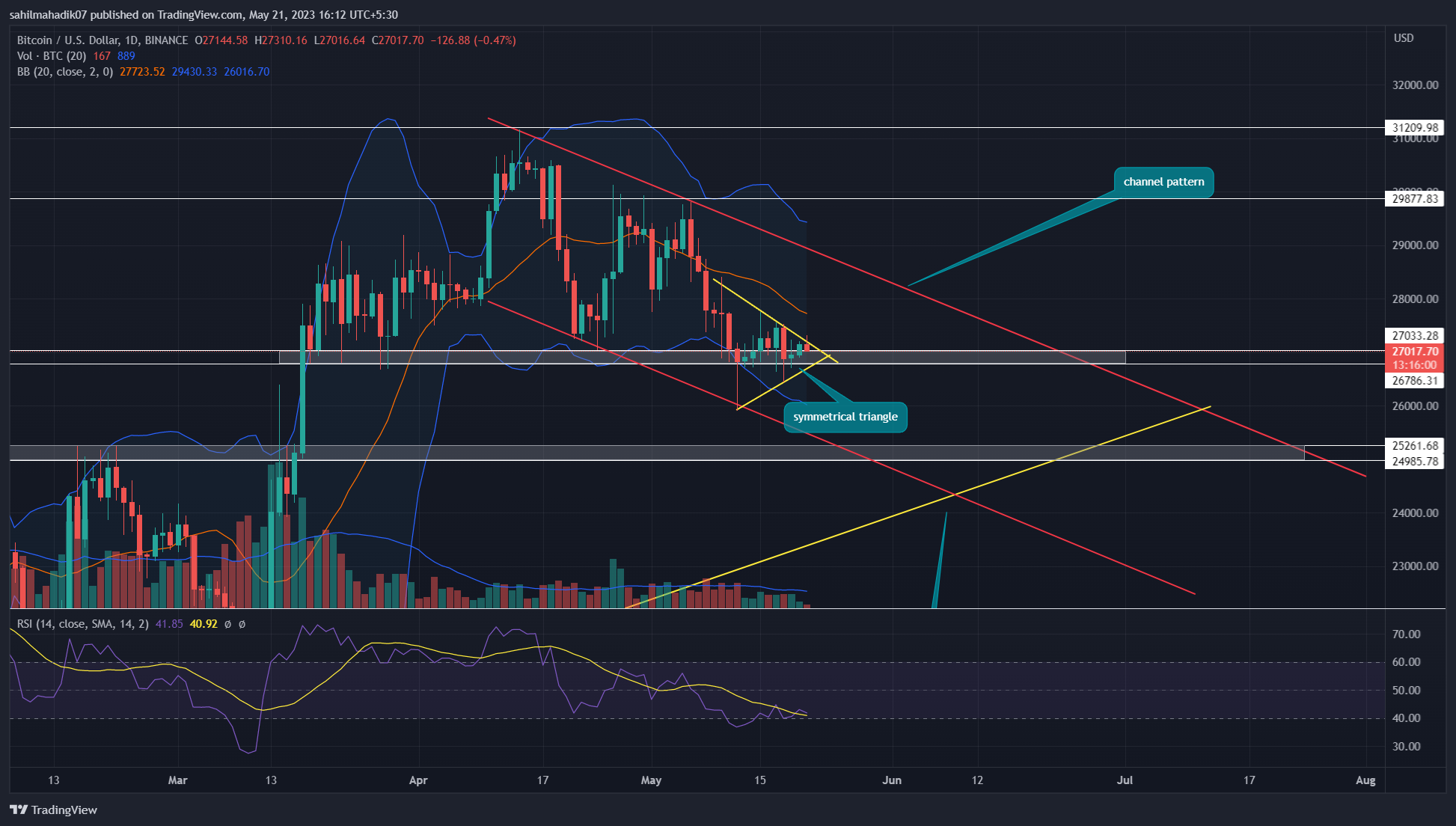 突破后的反弹可能会使比特币价格上涨 5-6%,以触及通道模式的阻力趋势线,该通道模式正在进行持续的修正阶段。
