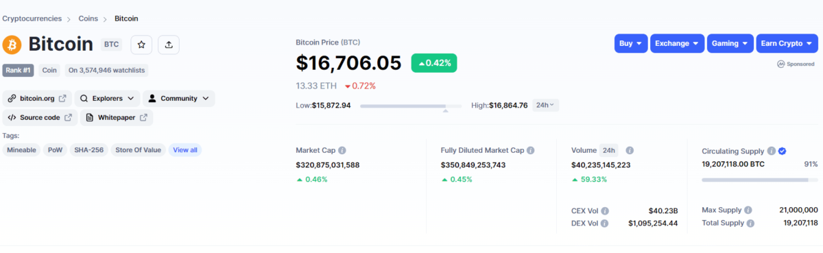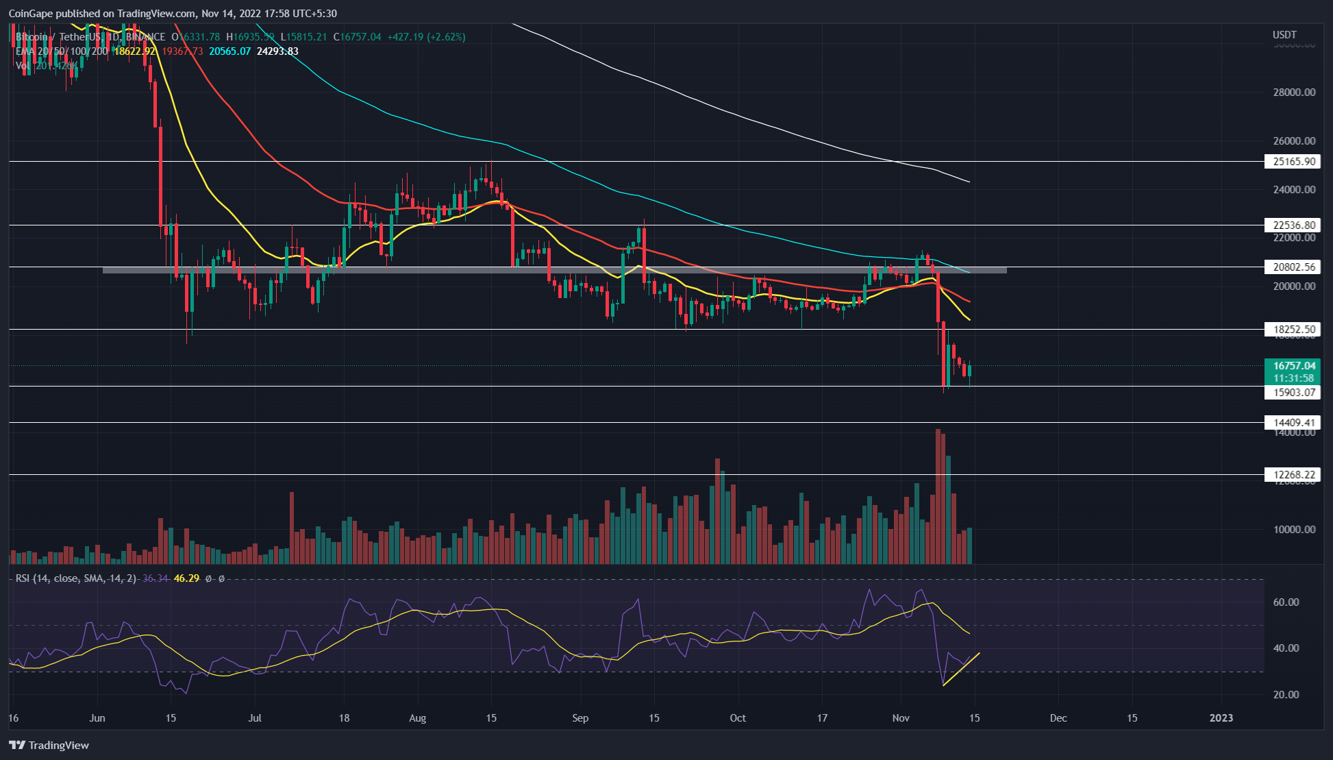 在持续的安慰中,比特币价格在一周内从 16000 美元的支撑位反弹了两次。**价格从上述支撑位上涨 5.9%,目前交易价格为 16781 美元。