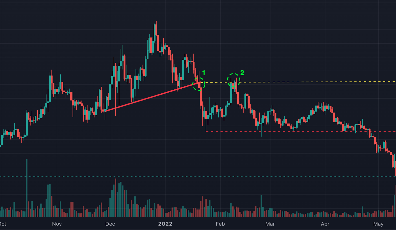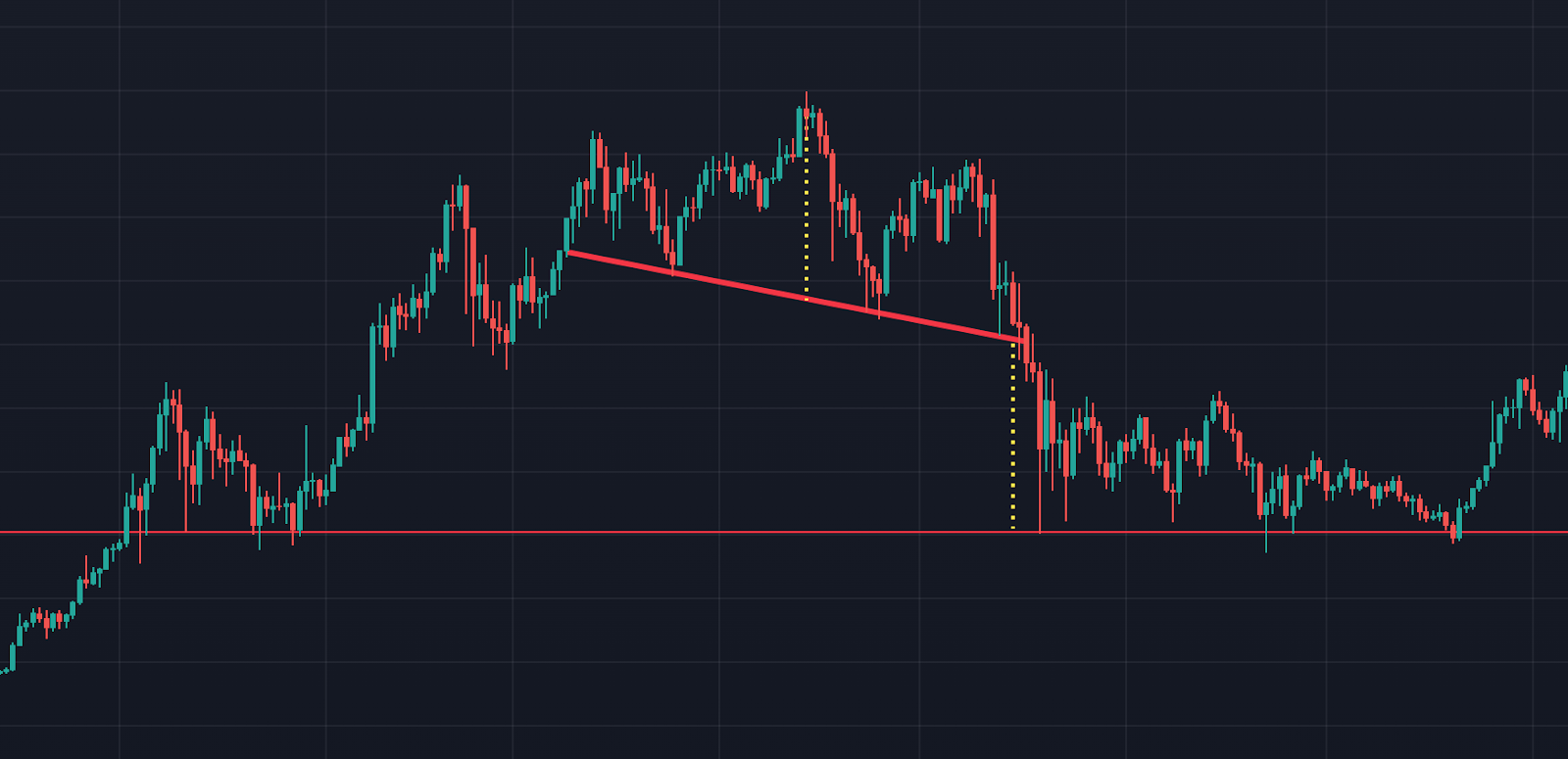 在上面的图表中,价格形成了一个有几个重叠的上升趋势颈线。在整个形态形成过程中,成交量在下降,在价格达到突破点时扩大。价格向下移动,形成支撑位(红色虚线)。