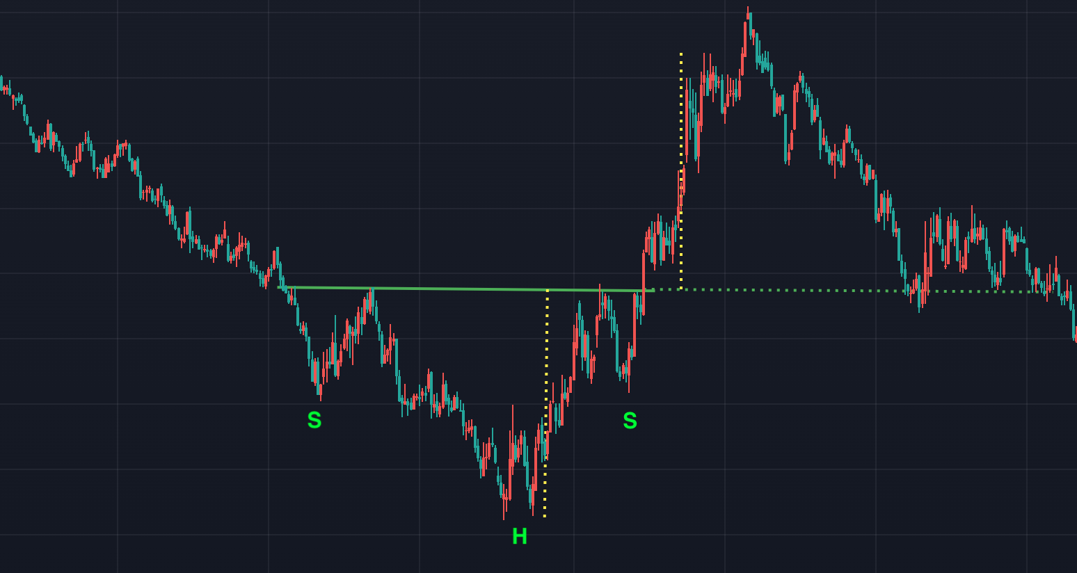 头肩形态有一个看涨版本,称为反向头肩或头肩底部。它与头肩形态相反,具有相同的形成规则。倒头肩形态由三个谷组成,中间的谷最深(头),而外侧两个谷的高度接近(肩)。该图案有一个连接其峰顶的领口。该交易量的作用类似于看跌的头肩,这意味着它往往会随着连续的谷底而减少,并在突破时扩大。